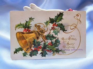 1906年浮雕金聖誕鈴冬青祝卡/古董明信片/老明信片