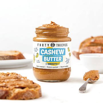 四十大盜腰果抹醬是由100%非轉基因腰果乾烤製成的,僅此而已。 小批量乾烤,無添加任何油脂,糖或鹽,即可享受卓越的風味。 是堅果醬愛好者的理想食品, 非常適合製作奶昔、純素零食、沙拉醬或直接塗抹在全麥吐司上。紐西蘭頂級堅果醬無添加任何化學藥劑,在靜放一段時間會產生沉澱、浮油,實屬正常現象, 敬請安心食用。食用前, 請先攪拌均勻, 風味更佳。Q1.腰果抹醬健康嗎?\t是的,所有堅果(包括腰果)都富含維生素,礦物質和天然抗氧化成分。當作為均衡飲食的一部分來食用時,杏仁抹醬是蛋白質和有益健康的脂肪良好來源。此外,杏仁抹醬還提供重要的礦物質,包括銅,鎂,磷,錳和鐵。此外,還有人體必需的維生素K、維生素B1和維生素B6...等多種維生素。鈣:對建立和維持強壯骨骼至關重要。輔助心臟,肌肉和神經功能。鎂: 幫助心臟、肌肉及神經維持機能。有助骨骼和牙齒正常發育。維生素B1: 幫助皮膚、心臟和神經系統維持健康。維生素B6: 幫助紅血球和神經系統維持健康。Q2.腰果抹醬有哪些有趣的吃法?1. 與麻油,辣椒和酸橙混合,製成美味的沙拉醬。。2. 可用來製作全麥麵包、種子麵包、米果餅乾、番茄和酪梨的美味沾醬。3. 與冷凍香蕉過濾水和椰棗混合在一起,製成美味的素食奶昔。4. 取代奶油奶酪製成無乳製品的蛋糕。5. 與檸檬汁,大蒜和新鮮香草混合,製成綠色蒜泥蛋黃醬。