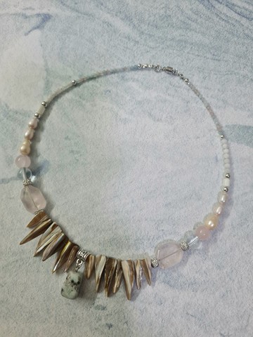 天然石與貝殼項鍊:薔薇石英、淨化石英、天然珍珠與貝殼。