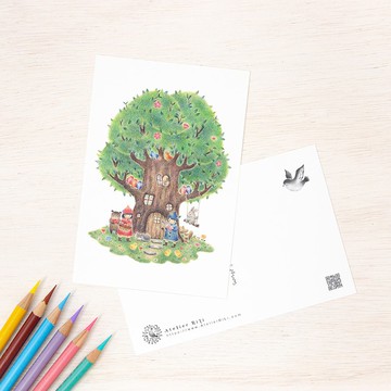 五入組。宛如繪本般的明信片 「孩子們與動物們的大樹屋」 PC-45