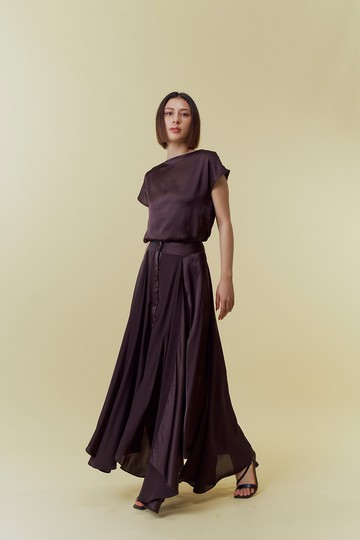 紫黑色緞面不對稱長裙
