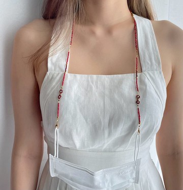 眼鏡帶和口罩主要材料是各種深淺不一的紅珠子,以間斷的花辮編織為特色手工穿有柔性鋼絲繩。總共需要2個小時。珠粒大小2-3毫米總長度60厘米還有一個珠寶袋。保養方法*所有珠寶均應避免與化學藥品,香水,染髮劑噴霧接觸,固體會使珠寶變形。*在暴露於化學物質,海水中之前,請移走珠寶*不時進行一些清潔因為汗水會使產品變暗*使用後請存放在商店的布袋中