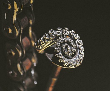 octopus ver. I — the Tentacle源自於一位喜愛 克蘇魯傳說 文化的老朋友之製作邀請,預計將發展名為 章魚系譜 的系列作。第一版本、採章魚觸手自然伸展之感受,呈現佈滿密集吸盤的肢體裏側,戒指其中一側邊類似傷痕之刻痕,其實是考據關於克蘇魯傳說 的文化象徵符文。