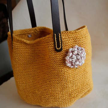 毛線編織手作禮物 橘色繡球花/煙火花 皮質提把 黃麻手編包