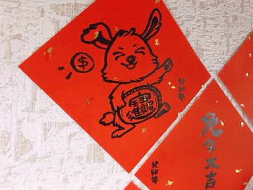 **手工刻印製作 **(商品照皆無修圖,油性防暈染油墨拍照易反光)尺寸 : 9cm x 9 cm 材質 : 灑金抗UV不退色不暈染紅宣紙 : 手工印製油墨使用-油性防暈染油墨款式 :五款 (可整組購買 也可單張購買)款式介紹:A.萌兔錢幣 (1入)B.萌兔大吉 (1 入)C.兔年大吉 (1入)D.大吉招財進寶 (1入)E.錢幣招財進寶 (1入)F. 萌兔招財大吉組合系列(五款各一)