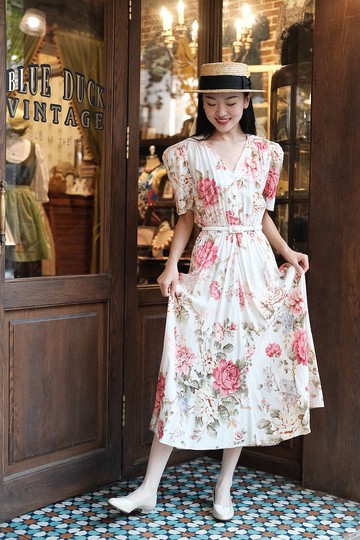 Vintage dress美產復古褶皺泡泡袖印花連衣裙古著洋裝