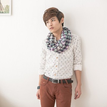 情侶系列~高含棉圓領袖身棋盤格長袖上衣(男
