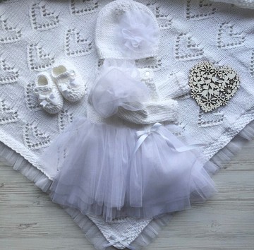 女嬰手工針織套裝:連身衣、蓬蓬裙、帽子、靴子。帶回家套裝。