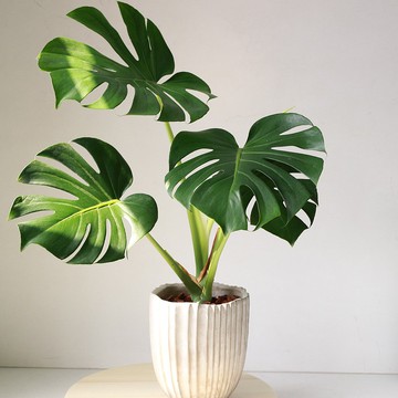 **龜背芋****Monstera deliciosa**⦿ 植物龜背芋是墨西哥熱帶雨林植物,是屬於天南科龜背芋屬,生長過程葉片會成羽狀分裂,由上往下看很像龜背,所以就被命名為龜背芋;龜背芋需要的是中度的散光,不可以太強光,不然葉子會燒焦窩⦿瓶器選擇搭配龜背芋的是特別特別耐看的創意水泥盆,瓶口有小幅度的高低變化,瓶身凹凸剛好好看的修長條紋,整盆高度有70~80公分窩瓶器尺寸開口直徑 : 18 公分高度 :20公分 ⦿日照觀葉植物最好都放在散光環境,所謂的散光環境就是不是直射光,有遮蔽物的概念,比如是窗戶旁邊或有遮蔽的陽台;有些植物特別需要強光,有些植物耐陰性特別強,我們會在標題指明光照特性 ⦿給水方式很多人問我們到底要怎麼給水?? 我們都強烈建議不要用澆的,用水盆放在植栽下方讓它自動吸水,待一兩個小時過後,再把水盆拿掉,這是一種最自然的給水方式,讓植物的根系自行吸收水分;多久澆一次水也是人們常問的,只要你摸土乾了或者植栽重量整個變輕了,就可以放上水盆讓它吸水,所有的植物都是一樣的窩當然我們也建議要適時的給植物補充營養,一個月給一次到兩次營養液是很洽當的窩,只要把營養液滴在水盆哩,一百CC一滴讓植物根系自動吸收就可以囉⦿禮品包裝方式如果是要選擇送禮, 不用特別加收費用,我們會在植栽上綁上好看緞帶;有送禮需求者備註說明就可以窩