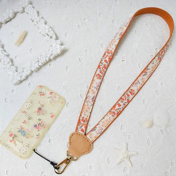 橘色系Y型減壓雙色花布真皮手機頸掛繩