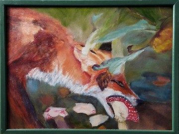 Oil painting on canvas "Fox and mushroom" in frame.The painting depicts a fox. the fox eats a mushroom. Forest landscape.The size of the painting is 30x40 cm.Painting in a wooden green frame.Painting on art cardboard. Canvas on cardboard.Thank you for your attention to my work.