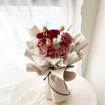 **/.尺寸./**5朵玫瑰31x35 Cm (純手工製作,花束±3Cm皆屬正常)▌出貨流程 ▌當天14:00後下單,會從隔日起計算1-3天出貨(不含假日)▌運送打包 ▌為了保護花為主,我們會用緩衝包材及紙箱打包__想客製化其他尺寸,可訊息給我們唷!__**/. 購買前須知 ./** ▪ 乾燥花、永生花為天然素材,本身脆弱,設計師出貨前一定會盡力妥善包裝保護花禮,但物流運送過程中難免會有碰撞而少許掉落,超完美主義者如可以接受歡迎下單喲 ▪ 全館花禮全是手工製作,設計師為了維護品質,若是急單需要先詢問,以免耽誤到您重要的日子 ▪ 本賣場有些索拉花&樹皮製成的花材,客人常會有疑問覺得花瓣破裂或是邊角缺角等等是瑕疵,但其實不是,樹皮製成的花材全都是手工製作,本身會保有樹皮自然的樣貌及紋路,可以接受的買家再幫我們下單哦 ▪ 照片皆為實品拍攝,但每朵花兒都是獨一無二的天然素材,也會因花況、氣候、季節、種植...的不同而有些變化,商品與圖片無法100%相同喲 ▪ 因為花材皆為季節性若遇缺貨,我們會在色系跟整體樣貌不變的狀況下,為您挑選及搭配最適合的花材去替代 ▪ 每張照片為實體拍攝,但因修圖、手機&電腦螢幕畫面的呈現會有些色差,如可以接受歡迎下單**/. 產品說明&保養 ./** ▪ 花朵必須保持乾燥,避免潮濕、陽光直射,適合放置在冷氣房或於濕度60度以下的環境 ▪ 若有灰塵可以使用柔軟的刷子輕輕刷拭,或是請以吹風機調製低溫低風速吹去灰塵 ▪ 隨著時間長久,花材慢慢褪色風化,皆屬正常現象 ▪ 永生花是鮮花經特殊技術處理,能保有鮮花般的色彩,會依個人保存方式而維持2-3年不等 ▪ 乾燥花是鮮花自然風乾處理,可擺放約半年至1年,避免發霉現象,可常開除濕機保持環境乾燥,若受潮發霉請以酒精擦拭**/. 購買後 ./**__ ▪ 您收到商品有任何問題,請不要急著給予差評,與我們聯絡後會盡快為您處理__