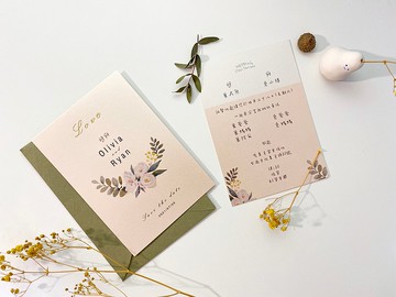 https://live.staticflickr.com/65535/51356923103_c2ac07fdab_b.jpg最好的日子 我喜歡和你鬥鬥嘴我喜歡和你搶廁所我喜歡和你逛超市我喜歡和你耍廢看電視我喜歡和你煮飯料理三餐我的喜歡都和你有關和你相伴的日子就是最好的日子https://live.staticflickr.com/65535/51355952377_50430cb077_b.jpg.最好的日子水彩插畫喜帖 .這款是以嗚嗚所畫的花束為主角,因為嗚嗚老師的花的作品總是呈現出淡雅的氣質,所以在思考用什麼樣的方式把鼻子的插畫和水彩結合在一起,想了很久,決定用線條來表現,更能襯托出這份喜帖的質感,對於這份喜帖的成品喜歡不已。-什麼是公版喜帖-公版喜帖-製作時間相對客製化來的短,省時,費用也較為經濟實惠,新人只需提供婚期資訊就能直接幫您印刷完成。是個不想要耗神費力的好選擇https://live.staticflickr.com/65535/51356923733_5c4bedd262_b.jpg花束是嗚嗚老師的手繪水彩作品 ,典雅的質感。https://live.staticflickr.com/65535/51356694046_9721116595_b.jpghttps://live.staticflickr.com/65535/51355952107_267bbab95e_b.jpg在喜帖的正面我們特地做了燙金的設計,讓整份喜帖的質感更佳的提升 ,也可以在這邊填上婚禮的日期。紙張上我們選擇的是285P星幻紙,拿在手上有一點分量喔!紙張的顏色有一點點偏黃,看起來更溫潤有質感,低調卻不失典雅。https://live.staticflickr.com/65535/51356923228_b790f8b1b9_b.jpg喜帖的正面可以放上你們的名字,即使是公版卻仍專屬於你們。https://live.staticflickr.com/65535/49966773067_563968f52c_b.jpghttps://live.staticflickr.com/65535/49966875191_c3e65733b2_b.jpg封口貼是嗚嗚老師精美的水彩花圈作品。https://live.staticflickr.com/65535/49682840336_f2b0ea4d65_b.jpg當然,也可以客製化換成你們的專屬人像插畫喔!!商品詳細說明:規格:每份含一張明信片邀請卡、25K空白信封(可可金.牛皮.粉紅.古銅.海洋綠.玫瑰紅.白金點艷紅)、封口貼紙備註:1.若需要加購地址燙金的話費用需與設計師另外討論2.可加價換購莫蘭迪色系信封(一個加12元)3.加購電子檔250元3.更改內文不收費,更改編排等等酌收美編費用100起(依內容複雜度)喜帖尺寸:10.5cm x 14.8cm 材質:星幻紙285P喜帖尺寸:10.5cm x 14.8cm材質:星幻紙285P產地:台灣公版喜帖訂製說明:下單後請和我們聯絡,將你們的婚期資訊傳達給我們,討論後約14個工作天會完成印刷。客製新人頭像插畫說明:下單後請和我們聯絡,將你們的婚期資訊和你們正面清晰的照片1-2張傳給我們,討論後會先畫草稿和新人確認後開始作業,作業時間約7個工作天,完稿後雙方確認無誤約14個工作天會完成印刷寄出。