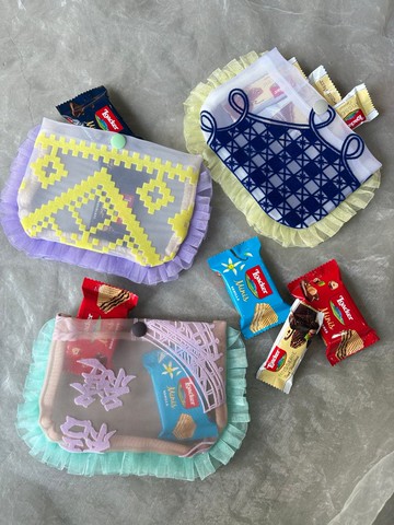 這款 S 尺寸的組合(3入組)比單獨購買價格更優惠,非常推薦。採用紮實的硬網紗製作,並印上原創植絨圖案,不易變形。材質略帶半透明,方便您一眼辨識內容物。無論是耳機、唇膏等小物,都能可愛地收納於包包中。由於布料挺括紮實,能妥善保護您收納的物品!作為禮物,也深受大家喜愛。尺寸上,比名片夾稍微大一些。尺寸15.5 × 11 公分(此為不含荷葉邊的本體尺寸)