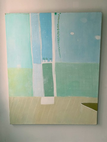 清掃日系列之一洗紗窗水氣將紗窗網面一滴滴穿透眼前的世界都明亮起來淺綠加一點白再加一點淺藍如此和諧的節奏也框住了白色與光芒...日常細微的片段好喜歡~65/80cm (w/h)oil painting/canvas2017