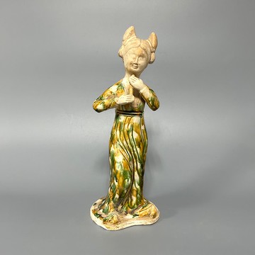通高(cm):32.5唐三彩是一種流行於唐代的陶瓷藝術,以其繽紛多彩的色彩和多樣化的造型而聞名於世。製作唐三彩的主要時間段為唐代初期至中期(618年至907年),這一時期的陶瓷工藝達到了高峰。唐三彩以其獨特的技術特點脫穎而出,通常製作過程包括製胎、雕花、施釉以及窯燒等精湛工藝。色彩方面,唐三彩以鮮豔的黃、綠、白、褐等為主,展現了當時工匠對於色彩的巧妙運用。造型方面,陶瓷製品的形狀多樣,包括人物、動物、植物等,尤其以陶俑最為著名,如陶俑駝、馬、俑俑等。唐三彩的製作技術不僅在中國廣受讚譽,也在國際上贏得了高度評價。這一瓷器藝術風格在唐代達到巔峰,為中國後來的陶瓷工藝奠定了堅實的基礎,對後世的藝術發展產生了深遠的影響。購買須知:本館商品皆為十年以上的收藏品,時間久遠可能會有老化痕跡,如氧化、掉漆、刮痕、修補等屬於正常現象。若您極度追求完美,建議慎重考慮。我們會盡力提供詳盡的品項描述和現況照片,請買家自行判斷物件價值。古董商品無保固期也無鑑賞期,售出後恕不接受退換貨。包裝上的錦盒/紙箱因收藏歷久非全新,可能積灰、脫線、老化,如無法接受請勿下單購買,感謝您的理解。#陶器商品易碎裂,部分有缺角修補痕跡,會盡可能拍攝原況供您參考。#本館商品皆只有一件,如對現況照片有所疑慮,請勿下單,沒有相同商品可提供換貨服務。#尺寸均為手工測量,若有些許誤差敬請見諒。