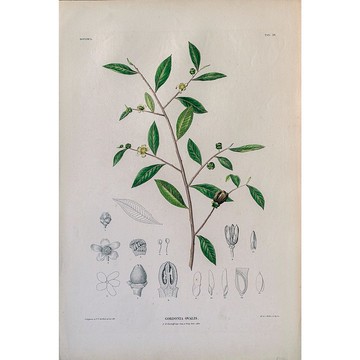 【圖1 - 圖2 為原件圖】【圖3 - 圖6 為示意圖】作者:Pieter Willem Korthals (1807/1892)名稱:大頭茶屬(Gordonia Ovalis),圖28,出自:【荷蘭海外屬地自然歷史紀要】(Verhandelingen over de natuurlijke geschiedenis der Nederlandsche overzeesche bezittingen by C.J. Temminck, published in Leiden by S. en J. Luchtmans en C.C. van der Hoek)。署名:J. Gaykema et P.W. Korthals / A.S. Mulder。技法:銅版,手繪上彩。年代:1839/1844。尺寸:31× 45 cm(畫面 ) 。40 x 50 cm (含卡紙)。備註:含卡紙裝裱 (不含框)編號:P D-F-H-21作品介紹:荷蘭在十六世紀即已來到爪哇,1619年攻佔島上的雅加達,當時命名為巴塔維亞,在此成立了荷蘭東印度公司。1799年,東印度公司解散,由荷蘭政府接管,展開荷屬東印度的世紀,直到二戰後,印尼在日軍的幫助下,與荷蘭作戰,1949年,印尼終於獨立。【荷蘭海外屬地自然歷史紀要】為荷蘭政府匯聚相關學者,在1839/1844年出版的書籍,研究荷屬東印度,也就是今天印尼的自然生態。全書分成三部分:動物誌、植物誌與人種地理誌。全書共1,379頁,插圖258幅。其中動物誌102張插圖,以石版製作,手繪上彩的82張;植物誌70張插圖,以銅版製作(部分石版),66張上彩;人種地理誌86張,以石版製作,29張上彩。植物誌的部分由荷蘭植物學家彼特・威廉・科塔斯(Pieter Willem Korthals, 1807/1892)編撰。1831年至1836年,科塔斯擔任荷屬東印度群島的官方植物學家,他的許多發現都是關於藥用植物美麗帽柱木(Mitragyna speciosa),這種植物原產於東南亞,是咖啡家族中的一種熱帶常綠樹,至少在十九世紀就被當成草藥,具有鴉片類藥物性質和類似興奮劑的作用。1839年,科塔斯發表了世界上第一部關於豬籠草的專著—【關於豬籠草屬】(Over het geslacht Nepenthes),便收錄在【荷蘭海外屬地自然歷史紀要】中。在此書中,他亦記錄了許多第一次出現在文獻中的植物。大頭茶屬(Gordonia Ovalis),是山茶科下的一個屬,為常綠灌木或喬木植物,分布於熱帶亞洲。科塔斯第一次記錄了這種植物。