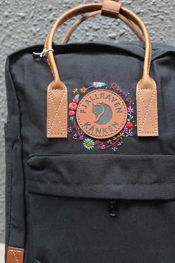 粉橘色花環主題--kanken全黑色包--手工刺繡設計訂製