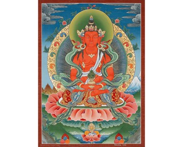 無量壽佛唐卡畫。- 佛教神祇:無量壽佛與長壽、智慧和慈悲相關。- 其他名稱:稱為無量壽佛或無量壽佛長壽佛。- 描繪:常在藝術和雕塑中描繪為一個和平和仁慈的形象,面帶寧靜的表情。- 象徵:手持充滿不朽甘露的瓶子,賜予祝福並延長壽命。- 三大長壽神祇:與白度母和尊勝佛母一起,被認為是佛教中的三大長壽神祇之一。- 觀想與冥想:與藏傳佛教的修行相關,據信能賜予靈性實現和啟蒙。- 冥想的好處:冥想無量壽佛可以培養更大的覺察力、智慧和對現實真相的更深理解。- 崇敬:在許多佛教傳統中受到尊敬,因其賜予長壽、健康和靈性圓滿的祝福。- 虔誠實踐:實踐包括誦經和祈禱,並獻花、香和其他象徵奉獻的物品。