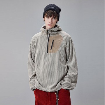 【産品介紹:】 戶外插肩連帽T恤/采用巴塔波浪絨面料采用提花絨采用空心紗線與鋸齒肌理編織,纖維間隙形成透氣“暖槽”,速幹不悶汗,抗起球性能優于同類。連衣帽帽檐彈力包邊,穩固不易滑落,活動更自在。加高雙層領口搭配拉鏈,強效防風鎖溫。胸前拉鏈口袋提升實用性,更添機能風。胸前l平繡精致醒目,增強品牌辨識度,功能與設計感巧妙融合。