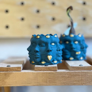 藝術家Pipe Cox正版授權(不含植物)。口徑56mm,高72mm(手工測量有些微誤差)。多色3D列印灰色啞光搭配金色炫光材質。盆器三層可旋轉。底部開孔設計,搭配相同設計水盤