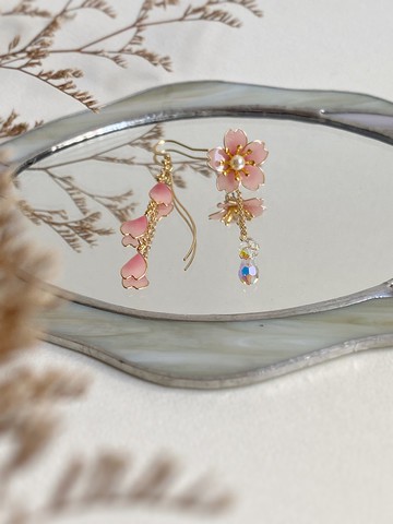 櫻花與飄落花瓣的協奏曲。花瓣以鏈子串起,搭配金色流線,如同花瓣緩緩落下的感覺。另一側的櫻花在耳垂上溫柔盛開,花瓣的漸層色澤細緻生動,為穿搭帶來春日少女的氣息!不論是日常或特別場合,都可以選擇配戴。尺寸 ▸ 櫻花寬約 20mm,最長長度約 50mm。款式 ▸ 針 - 醫療鋼直針+黃銅鍍金勾針(可更換為鋼色醫療鋼勾針)⠀ ⠀ ⠀ 夾 - 螺旋式耳夾 / 矽膠U型夾(請備註,若無則預設螺旋夾)材質 ▸ 美國進口銅線、日本製樹脂、鈦鋼鍍金鏈、施華洛世奇水晶元素୨୧┈┈┈┈┈┈┈┈┈┈┈┈┈┈┈┈┈┈୨୧⚠️注意事項⚠️.樹脂花性質較脆弱,請避免重壓撞擊,配戴時請用指腹輕推。.庫存數量為材料數量,非現貨數量。.作品若有標記「現貨」會於 3 - 5 個工作天出貨。.接單製作時間為 10 - 30 個工作天,急件需求請先私訊討論。.手作品每個皆是獨一無二的存在,可能與照片有些許不同。.製作過程中可能會有些微氣泡等等,請理解再訂購。✨日常保養✨.一般飾品都是消耗品,但好好的保養能讓它陪你更久。.配戴時避免直接接觸香水、髮造型品、防曬等。.樹脂部分如需清潔請用棉棒沾水輕拭,僅耳針可使用酒精清潔。.不要戴著飾品洗澡、睡覺。.未配戴時請擦拭汗水油脂後再收納,避免高溫及陽光直射。IG : fragments_of_dreams_FB : 少女的夢境碎片