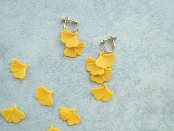 【商品介紹為 Pinkoi 翻譯,商品會由日本設計師出貨】黃色的銀杏葉子們從耳環 / 耳夾上垂下來。左右兩邊的葉子數量不同的不對稱設計。 一邊是只有兩片葉子的簡約設計,另一邊則是3片葉子加上後方長鏈上垂下來的葉子。-------------------耳針(防過敏:鈦耳針)耳夾(螺旋式)無孔耳環| 透明樹脂(防過敏)-------------------[材料]軟陶▼什麼是軟陶軟陶經過加熱後能定型硬化成塑膠狀。是一種熱固性黏土。地下3階主要是使用德國製或是美國製的軟陶。[注意事項]・在製作過程中,銀杏表面可能會附著粗糙的部分和不平整的部分。・每個作品都是手工製作,彎曲的弧度、顏色的濃淡,可能會有所不同,希望可以見諒。・每個作品的銀杏大小可能有誤差。希望能理解手作商品無法做到每個作品都沒誤差。・是將軟陶弄薄延展做成的。多少有點彈性,還請小心使用,避免壞掉。[清潔方法]・弄髒或是沾到汗水的情況的話,可以用棉花輕輕擦拭。碰到水沒有關係,但請不要長時間浸泡在水中,會造成軟陶劣化。可以到下面連結頁面購入禮物包裝。https://www.pinkoi.com/product/JEZ7K7bL・盒子・小卡(4種款式可選)・袋子https://live.staticflickr.com/65535/49808959323_1d7a940bb0_b.jpg