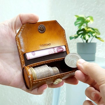 嗨~歡迎光臨 Destiny 命定革物|第三十二吉室|,我是室長Lina你是否有過這種經驗?排隊結帳時,因為零錢掏半天,而被收銀店員或排隊隊伍行注目禮,本來低調的你瞬間成為目光焦點…之後,為了不耽誤結帳時間,每次付現時只好使出「鈔」能力,雖然解決了一時的麻煩,但也讓零錢越積越多,得幫「孔方兄」想個好出入…**【設計概念】**「一筒金零錢包」的筒狀造型來自於相機底片罐,小時候室長Lina爸都會用底片罐裝零錢,放在車上備用,覺得蠻方便的,於是以此作為設計發想。**【商品說明】**一筒金零錢包,筒狀造型,一手掌握的大小,從1元到50元,可以把零錢排得整整齊齊,付錢時一目了然,解決零錢掏半天的窘境,不再堆積零錢,讓零錢有個好出入,是收納強迫症及零錢囤積症的心頭好物。夾層最多可放2張鈔票,側有圓環扣,可掛於包包、褲頭等。**【顏色】**◆ 此為「一筒金零錢包」系列的手染漸層款,是室長我使用植鞣革專用染料自行手工染色,由中間向外,由淺至深,染成漸層的黃棕色,染色完有做定色處理,不容易掉色(當然過度摩擦還是有掉色風險的,詳見【如何保養】),也因為是手染,顏色會因每次染色的次數、濃淡、力道…而不太一樣,所以保證每個染完都是獨一無二的。◆ 這款漸層黃棕色具有復古感,隨興、不均勻的色塊更凸顯了作品的個性,不新不舊的感覺,非常耐看。◆ 五金:金色(預設) / 銀色 / 古銅色→五金預設為整組金色,如需更換為銀色或古銅色五金,請先詢問有無零件可換**【其他顏色】**想看其他顏色嗎?歡迎到我的設計館逛逛→pinkoi.com/destinyleathergoods如果看到自己的命定色售完,真的超想買的話,可以直接以站內訊息問問室長Lina或按下「我要排隊」來許願,這樣我就知道下次預購要製作什麼顏色囉!**【材質】**◆ 天然植鞣革(皮面防潑水處理,微亮面)◆ 內裡為防潑水布◆ 磁扣:鐵+合金◆ 360度旋轉和尚頭:黃銅+高品質電鍍◆ 圓環扣:鋅合金電鍍**【尺寸】**◆ 零錢包本體:約 長 8.8 cm /寬 3.5 cm /高 3.5 cm加側邊 旋轉和尚頭+圓環扣:長度約增加 4 cm(圓環扣拉直測量)◆ 圓環扣 內直徑:約 1.9~2 cm /線徑:約 3~4 mm /開口:最大可開至 1 cm※ 五金零件如遇廠商缺貨,會使用相似的五金替代,形狀尺寸和商品圖可能會有一點點差異,但不會差太多。**【內容量】**◆ 最大可放 NT$50 硬幣(直徑約 2.8 cm 的硬幣),但因為中間磁扣處結構稍厚,所以建議放兩旁。◆ 內部空間長度約 41枚 NT$10 硬幣疊起的厚度(約 7.6 cm)◆ 上蓋夾層最多可放2張新台幣鈔票(短邊為 7 cm 的鈔票,長邊需對折2次)**【淨重】**約 32 ±5 g**【商品特色】**◆ 手染漸層特殊色,保證每個都不太一樣,給每個獨特的你/妳◆ 筒狀淺口設計,一手可掌握的大小,容量足,零錢可立起來,好取用◆ 上蓋夾層可放2張鈔票,以備不時之需◆ 強力磁扣設計,強力夠,好開闔◆ 360度旋轉和尚頭+圓環扣,掛於包包、褲頭時,可360度旋轉,不用擔心方向性◆ 亦可收納其他小物,如印章、口紅、小飾品等**【使用時機】**◆ 適用於各種「只需銅板價,就能解決」的時刻,例如去超商取貨、買手搖飲、買便當…各種只是出去一下下,卻又懶得背包包出門的情境。室長我經常只裝一些零錢、2張百鈔,把「一筒金零錢包」掛在褲頭,鑰匙放在口袋,兩手空空就出門了,這樣的好處是「絕對不會不小心花太多錢」。◆ 又或是你跟室長我一樣,習慣將鈔票和零錢分開放,就可將「一筒金零錢包」掛在包包裡面,付錢時只需伸手一抓,不會撈來撈去找不到零錢包,很方便的。**【使用方式】**◆ 一筒金零錢包的主要目的是「好使用零錢」,所以建議最多只裝8分滿就好囉!千萬不要把它當存錢筒使用,如果全裝滿的話,一來會太重,長久吊掛可能導致包體側邊變形,二來沒有空隙,反而不好拿取零錢,三來上蓋夾層若有裝鈔票,零錢又裝太滿,會蓋不起來。要記住,讓零錢有出有入,才是零錢包的正確使用方式,否則你該選擇的是存錢筒。◆ 收到零錢時可以照大小排列,靠近圓環扣的地方放1元,遠離處放50元,掛起來才不會頭重腳輕,找錢時也較一目了然。◆ 使用中可能因為搖晃,導致硬幣順序亂掉(很大力才會),但因為筒狀造型,就算亂也是「亂中有序」,只要稍微前後搖晃一下,讓硬幣立起來,集中在一側,還是很好取用的。◆ 建議上蓋夾層放2張百元鈔就好,雖然千元鈔也放得下,但如果找回很多百元鈔,就放不下了,除非你有另外的鈔票夾,或本來就要付千元。◆ 請將「一筒金零錢包」掛在安全的地方,使用後記得「按壓一下」磁扣,發出「啪」一聲,確定上蓋關好關滿,不然會上演「撿錢囉~」的戲碼。**【製作細節】**◆ 皮面有防潑水處理,微亮面◆ 手工染色有做定色處理,不易掉色(當然過度摩擦還是有掉色風險的,詳見【如何保養】)◆ 皮邊有封邊處理,不會毛毛的◆ 有防潑水內裡布◆ 底層及側邊內部有加固,支撐性足夠,不易變形◆ 360度旋轉和尚頭與包體之間,以螺絲鎖固,不易旋開脫落**【如何保養】**◆ 手工染色是在皮革表面擦染所需的顏色,並非像透染一樣,顏色會深入皮革深層,而染色定色處理就是讓定色劑在皮革表面形成一層保護膜,保護皮表染色不掉色,當然這層保護膜也可能因為過度、長久或用力摩擦而被破壞,最終導致掉色。建議平常可定期上薄薄一層皮革專用保養油(如:貂油),油脂除了可以軟化皮革,還可形成保護膜,加強定色及防潑水的效果。◆ 皮面防
