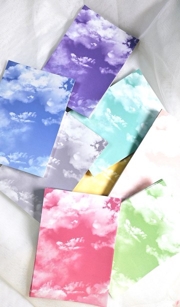 晴空雲彩 背景紙材質:描圖紙張數:共 32 張,8 種顏色,每種顏色 4 張尺寸:8.5 x 13.5 公分*裁切過程可能會有 5mm 的誤差。顏色:藍色、粉色、紫色、綠色、黑色、棕色