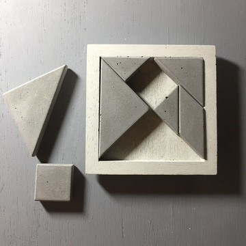 七巧板是童年回憶,所以很多人也認為這是一件玩具。對於我們用水來創造一件七巧板感到疑惑。水泥是興建大廈及基建的物料,而我居住的城市也被標籤為石屎森林。正因如此,很多人也會忘掉了水泥的基本,就是「可塑性」我們把水泥應用在創作七巧板上,因此七巧板變成了一件富當代感的家具或者是一件富現代的辦公室陳設,這正是我們想做到的:一件物品除了實用以外就是富有藝術性以,及想衝破傳統的框框。我們的七巧板是淺灰色及深灰色的結合,但過程中我們並沒有加入色素,我們只用了水泥。在作品的表面上沒有打蠟,去維持水泥原有的質感。[尺寸]11.6cm x 11.6cm x 2cm[此為清水模作品]清水模...即是待整個 “攪拌,澆注,固化,脫模” 過程完成後就不再作任何表面處理,不會用任何方法去遮蓋疤痕或顏色差異,所以每個細節都不能馬虎。需要親眼看過,摸過才會懂得欣賞用這技術造出來的水泥之特色。[我們的話]很多人眼中“水泥”是粗糙,冰冷﹐沉悶。在我們眼中“水泥”是幼滑,溫暖﹐有趣。希望透過我們的水泥作品令更多人認識到“水泥”其實也有他的另一面。[小小提示]***水泥接觸到水之後,表面會略為深色,過了一會,水份乾了,作品會呈現原本的顏色。由於他有這個吸水的因素,所以如果是咖啡或茶或其他有顏色的水份粘上去之後,作品表面那污跡不會散去。***作品表面會有微細的氣泡,對於一些非常討厭氣泡的人,那你要想想可能水泥這物料其實不適合你***雖然這是一件純灰色的作品,但由於是人手製造及水泥的特質,整個鐘面不會呈現單一的灰色[產地/製造方式]產地香港,手工製作