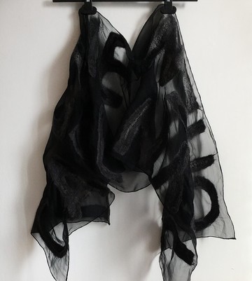 SAMPLE綴有脫落氈化字母的黑色絲綢雪紡圍巾。獻給女性的個性化禮物。 努諾氈化的絲綢雪紡圍巾。 字母圍巾。獻給女性的冬季時尚配件。時尚達人的禮物,送給青少年的生日禮物,送給媽媽的禮物。♥請提供您希望寫在圍巾上的名字!通常在此尺寸下,我可以排版 12-15 個字母。↕尺寸為 16 x 69 英吋♥材質 - 絲綢雪紡與美利奴羊毛訂製商品