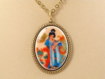 藝妓瓷浮雕項鍊。日本女士東方吊墜項鍊。手工製作的藍紅色橢圓形吊墜項鍊。中央橢圓形浮雕尺寸:30 毫米 x 40 毫米,鍊長:50.5 厘米(45.5 厘米 + 5 厘米附加鏈條以調節長度)。與鏈條一起出售!顏色:橙色、火紅色、珊瑚紅、桃紅粉色、米色、天藍色、電光藍、橄欖綠、藍綠色、藍綠、金屬件顏色:古金色,材料:瓷器、黃銅配件、鍍金黃銅鏈條。貼花技術用於在凸圓形陶瓷上製作圖片 - 它非常安全、耐用且使用壽命長。