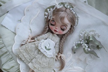 鈴蘭花 刺繡 法國蕾絲 Blythe娃衣 圍裙 手工做 leavers lace