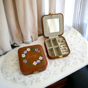 【客製】旅行迷你首飾盒/耳環戒指收納/金扣帶鏡款/手繪花/寫名
