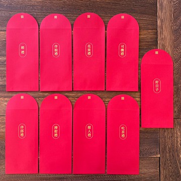 **◆紅包袋樣式◆**【套裝】以下9款各一張$130元聘禮、伴娘禮、花童禮、司機禮伴郎禮、捧柑禮、媒人禮、吃茶禮好日子~此款為婚禮通用紅包袋自用送禮兩相宜**※套裝也可自行選擇款式於訂單備註即可※**【單款】每張$15元/於訂單備註款式即可【空白紅包袋】一包10入$50元**訂購金額達$100元才會出貨****◆紅包袋材質◆**萊妮暗紅100P (厚度0.14mm)暗紅色無亮光材質帶有布織紋路紙質如商品相片 囍&文字都是手工燙金處理**◆紅包袋尺寸◆**不含半圓背蓋 9X18公分(每一批尺寸會有些微誤差)**◆基本訂購量◆**基本金額達$100元才會出貨**◆如需自備檔加燙金可訊息連絡設計師報價◆****◆注意事項◆**紙製品大量存放難免有折痕或少許壓痕,燙金採壓力加工,背面有燙金壓痕屬正常現象,每一批紙質一定會有些微色差,顏色無法百分之百一模一樣要求如無法接受小瑕疵或要求完美者,請勿訂購,恕不接受退換貨。