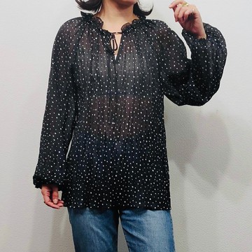 日本製【圓點荷葉邊褶皺襯衫】 圓點 荷葉邊 黑色