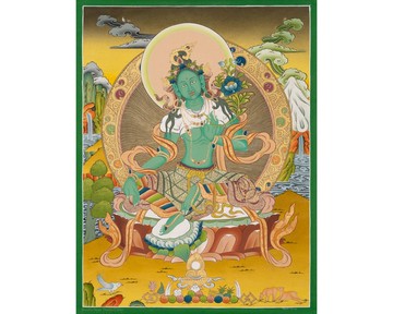綠度母是一位慈悲的神靈,提供身體、心靈和精神上的安慰和保護。她被認為是所有佛陀或覺悟者的母親。作為一位菩薩,度母致力於結束所有眾生的痛苦。她身體的綠色代表激發所有眾生內在的佛性。她的臉部描繪出溫柔的微笑,像母親看著心愛的孩子一樣注視著眾生。她賦予並幫助所有眾生去除障礙,完成與佛教教義相關的活動。度母右手持優缽羅花,象徵著純潔和實現。她左手也持有一朵優缽羅花;兩根手指觸碰在一起,代表著大悲和智慧的結合。伸直的三根手指象徵著皈依三寶:佛、法、僧。她的右腳伸展,表明她隨時準備站起來幫助眾生解除痛苦。根據佛教傳統,度母是由另一位菩薩觀音的淚水中誕生的。度母象徵著對所有眾生的慈悲。規格:尺寸:61 x 46 厘米由尼泊爾的技藝精湛的藝術家創作材料:棉布畫布、天然石色和24K金適合冥想、瑜伽和家居裝飾裝裱:傳統錦緞可以裝飾你的唐卡畫提供各種顏色和質量的絲綢錦緞選擇錦緞價格從$50起,根據質量和尺寸而有所不同送貨:享受免費送貨服務預計在2到4個工作日內送達,並提供保險以保證安心退貨政策:30個工作日內接受退貨商店信息:“感謝您瀏覽我們的Pinkoi商店!探索我們多樣的唐卡收藏,發現由專注和熱情製作的珍寶。從精緻的手工唐卡到佛教靈感的藝術品,總有一款適合您。您的支持對我們非常重要。我們隨時準備幫助您,有任何問題請隨時聯繫我們。感謝您在我們的旅程中扮演的角色。探索我們的商店,發現您下一件珍愛的物品!”願一切眾生皆得安樂!