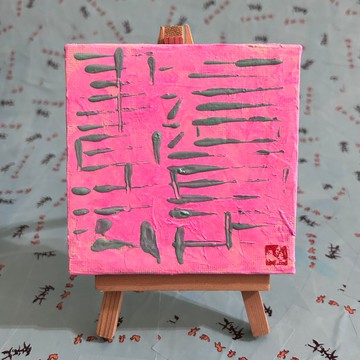 這件作品起初以塑膠刮刀鋪設底色,原本曾嘗試使用尺來創作,但最後還是回到了刮刀這個更直覺的工具。畫面底色由深淺不一的粉紅色區塊構成,我希望這樣的處理能為整體增添一點活潑的氣息。這是一件陳芳儀的書法作品,融合了繪畫與書寫的元素,展現出個人風格與藝術實驗的精神。這是書法媒材:壓克力顏料、仿麻畫布、印泥、打底劑、壓克力顏料保護漆。尺寸:10x10cm附原作保證書、畫架。