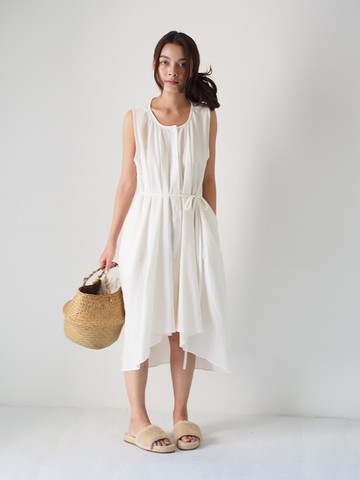 法國亞麻 格紋無袖細褶洋裝 連身裙 米灰