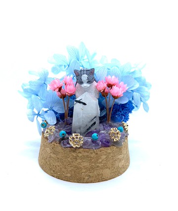 蔚藍花園-貓咪與黑碧璽電氣石-公仔/水晶/乾燥花玻璃罩擺設