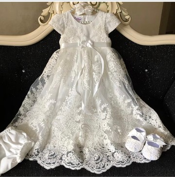 帶頭帶的白色蕾絲連衣裙、女嬰內褲和鞋子。洗禮裝