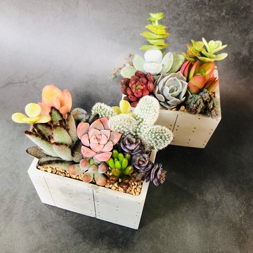 清水模多肉送禮盆栽【商品內容】●由設計師挑選7至9種顏色鮮明且高低不同層次的多肉植物組合盆栽(每一盆都是獨一無二的喔!照片僅供參考)。●來自【氺の尼 泥研製所】的清水模盆2入(長約7.5cm、寬約5cm、高約5cm)。●透明提盒1個(11cm*11cm*11cm)。●賀卡1張(請在備註說明賀卡內容或私訊設計師(賀卡內容為打字列印))。●植株照顧說明【注意事項】●接單訂製,下單並完成付款後3-5個工作天內出貨。●水泥盆皆為純手工製作,如有些許氣孔或色差正常現象,完美主義者請勿下單。