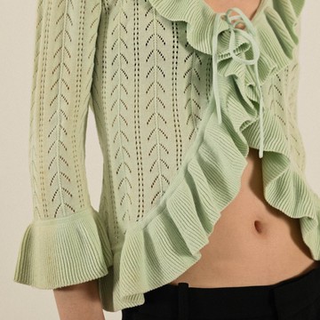 |商品資訊- 肩寬40cm/ 胸寬45cm- 袖長50cm/ 全長55cm- 針織面料。- 荷葉綴飾。- 胸前綁帶。- 多處輕微泛黃。- 產地材質標籤佚失。|關於古著那舒比商品皆是古著,並非全新商品。每一件在上架前皆經過仔細的清理與檢查,任何在外觀上超過「2cm」的污漬或是破損,我們都會在描述中清楚標記。不過古著畢竟不是全新商品,不免會有一些使用感,例如細部脫線、輕微脫色、細微斑點,我們無法逐一描述,若您是對於衣物狀況相當要求的客人,有任何疑慮都歡迎您傳訊息詢問,我們將盡力回答。|關於尺寸商品尺寸皆是平放測量的寬度,人工測量可能存在「2cm」內的輕微誤差,實際尺寸請以商品為準。建議您在購買前先確認尺寸,減少收到實際商品時尺寸不合的問題。若對服裝大小比較沒有概念,可以利用我們提供的尺寸,與現有的衣物實際測量比較,會更加準確。|關於色差商品皆以高階數位相機拍攝,已盡量將商品顏色誤差縮減至最小,但由於不同載具的螢幕顯色不同,加上每個人主觀判斷差異、觀看光線明暗度等等不可控制之因素,我們無法保證商品完全無色差。對商品顏色較為要求之顧客,建議下單前先向我們詢問。