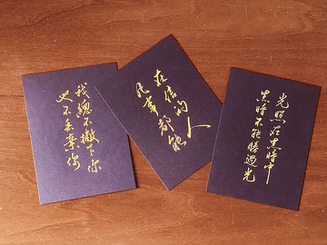 《聖經書法酷卡X熱血一號》一套3款「在信的人,凡事都能」聖經 可9:23「我總不撇下你,也不丟棄你」聖經 希13:5「光照在黑暗中,黑暗不能勝過光」聖經 約1:5尺寸:12.5X17cm厚度:300磅紙張:星空藍印刷效果:燙金包裝:透明袋售價:NT$300PS:不附贈信封#品牌理念研寫樂X 播種文創,以「聖經」為品牌重點設計元素,並以創意設計呈現聖經中的真理和福音,亦會與不同藝術家及創作人進行聯名合作,結合各行業的豐沛力量推廣福音。這些原創福音禮品將帶著「信、望、愛」的理念,希望大眾從中得到心靈上的幫助,並以上帝的愛,滋養日常生活。#藝術家簡介熱血一號表面上是從事印刷行業的中年大叔,真實身份卻是熱血於研究中國書法的藝術家。擅於MV手寫字幕,曾與多位歌手合作,如梁靜茹、廖士賢。平常也做刺青文字設計、品牌手寫字體。曾與台灣文創品牌「Mao’s樂陶陶 X 鎮瀾宮」合作聯名商品。