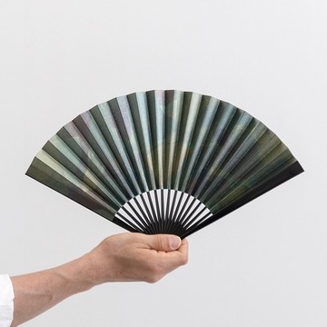 【聚焦於素材的趣味,打造沉靜夏日小物】為了展現素材的獨特魅力,扇面上以手工隨機壓印了表情略有差異的箔片,創造出富有層次感的斑紋效果。扇面上的主角——箔片,採用了「燻銀」。透過對銀箔進行仿舊處理,賦予其獨特的色澤。銀具有與大氣中的硫化物反應,表面形成一層薄膜的特性。當這層薄膜形成至足以阻擋光線穿透時,在人眼看來便呈現黑色。這正是俗語「燻銀」現象的由來。此「燻」系列,讓您能同時欣賞到薄膜在緩慢生成過程中,所呈現的過程色澤,以及完全熟成後的燻銀光澤。由於是利用素材本身的特性來獲得色澤,而非人工染色,因此每一把扇子都擁有細微差異的獨特質感,世上再無第二把相同製品。【設計】採用日本傳統的經典扇骨造型。寬廣的扇面面積,更能凸顯圖案與紙質素材的印象。選用黑色扇骨,與扇面形成鮮明對比,造就了此款兼具現代感與個性的單品。寬大的扇面面積,即使扇骨數量較少,也能確保足夠的風量。收合時,扇子呈現纖細而優美的姿態。尺寸精巧,收納於包中也不感負擔。【細節】扇面加工、摺扇、扇墜等各個工序,皆由各領域的傳統工藝師們通力合作,打造出此款散發著京扇子特有高級感的精緻手工扇。運用京都自古流傳的箔押、金彩加工等傳統技術,追求以印刷難以表現的獨特質感,是原創的精品之作。【日本的扇子】在日本,扇子不僅用於神道儀式或祭典,更融入了藝道、武家及貴族社會的禮儀之中,如同刀劍一般,長久以來一直是日本人隨身攜帶的文化象徵。此外,扇子因其末端展開的形狀,蘊含著祝福對方未來繁榮昌盛的寓意,自古以來便有作為贈禮的文化。除了在炎熱季節中,方便收納於包中搧風納涼的實用功能外,亦可作為觀賞用途擺設於室內,這款在日本擁有悠久歷史、蘊含文化與認同感的代表性特產,承載著豐富的意涵。【素材】扇面:和紙、銀箔扇骨:竹【尺寸】高度:約 22.5 公分 × 最大寬度:約 40 公分展開時,搧風時能聞到淡淡的日式清香。每件皆為手工製作,可能存在些微個體差異。此外,由於使用金屬箔,光線照射角度不同,可能會呈現不同的色澤印象。敬請見諒。若有任何疑問,歡迎隨時洽詢。【長期保存方法】不使用時,請將扇子保持閉合狀態擺放,有助於防止產生開扇痕跡,維持良好形狀。考量到竹子與紙張的特性,休季時若將扇子收納於盒中,並繫上原附的紙環(セメ),便能以完好的狀態迎接下個季節。因此,若您妥善保管紙盒與紙環(セメ),相信能讓扇子長久保持美麗。若不慎遺失,亦可用繩子鬆鬆繫住作為替代。