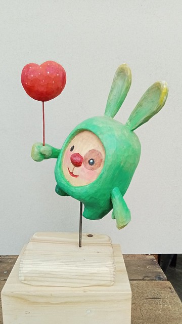 心煩意亂的綠兔手工雕刻的松木製品明亮的壓克力顏料作品包括一個木質底座。僅一次雕刻,無重複雕刻。綠兔和紅兔套裝各 1 隻高度(底座到中心)20 厘米寬度(從左到右)12厘米深度(底座到兔子尾巴)9.5 厘米