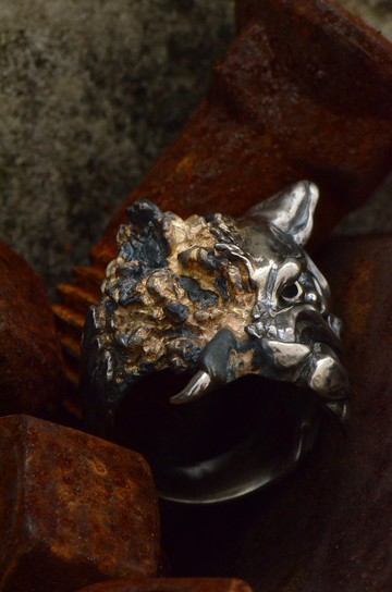 **熔金大貓戒指**Big cat ring18K gold + 925Silver 這個大貓戒指是我即興創作20個小時的結果,即興創作在我這的方式是在備料時有個大概的主題,然後邊做邊想細節,走一步算一步。 大貓戒指在我製作的過程中所想的是兩邊不同效果的展現,一邊是我平常慣用的岩石紋理處理在加上把部分骨骼拉出來變成外骨骼的概念,來代表*內在*。 另一邊是把市面上常見動物處理毛流的部分給拿掉,把毛流跟肌肉做融合所製作出的線條展現手法,兩面的交合處利用高低覆蓋手法展現一定程度的撕裂感,以及一邊包覆另一邊的感覺,藉此讓這面有更強烈表達*外在*的細節。**可以製作超過20號的大戒圍,需要請下訂20號並且備註實際尺寸給我**購買須知:所有商品皆採用訂購方式, 純手工製造需要一定製作時間.將於收到訂單後依順序製作 大約製作時間為20~36個工作天.可接受雷射雕字(價錢另計), 須提供內容以及字型, 如不提供自行將由設計師自行判斷.提供終生免費保養及一年內維修服務, 不包含人為破壞因素, 買方需自行負擔寄回之運費.此產品為客製化手工製造, 恕不接受任一退換貨原因, 若有任何疑慮請來信詢問,會在短時間回覆您飾品保養:配戴時請勿大力敲擊, 拉扯, 摩擦.硫化處理之飾品請勿使用清潔劑清洗, 泡澡, 溫泉時 請勿配戴.**大貓在手,兩種風格同時擁有**台灣設計/台灣純手工製造