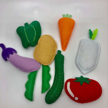 蔬菜包 ($50)分 類:啟蒙玩具學習目標:認知能力玩 法:認識青椒、青豆、青瓜、番茄、馬玲薯、茄子、紅蘿蔔和白蘿蔔7種蔬菜