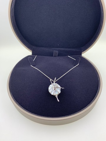 芭蕾舞者頸鍊 / 胸針由資深金匠手工製作,把設計精粹忠實呈現。選材18K白金、天然鑽石及天然貝母結合而成。38mm x 23mm 半立體造型的芭蕾舞者很容易成為焦頭所在。鑽石都經過嚴格挑選,採用G-grade 或以上顏色,十分潔白。貝母顏色皎潔多彩。頸鍊同樣以18K金製作,長度可輕鬆簡單自行調校。