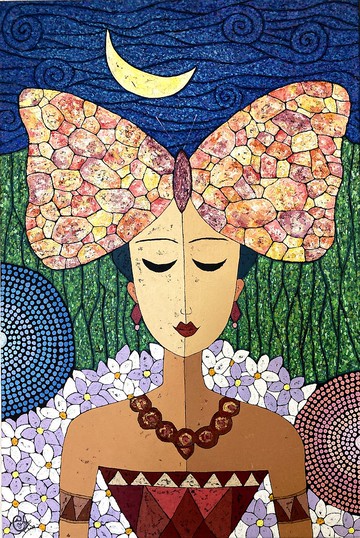 蝴蝶女孩繪畫《生命流動1》Butterfly Girl Painting - Flow Of Life 1一個與滿月的深刻連結,看起來有些類似民俗臉譜或原始面具。這個此系列作品將原始臉譜變成有著蝴蝶翅膀的女孩,這個印象來自我年幼時非常喜愛的日本動畫《小巫仙ヤダモン》。這幅作品是由畫刀所繪製完成,您可以發現許多有趣的紋理及有別於畫筆的立體效果。畫中的女孩膚色很特別,她的兩邊臉頰及脖子都是不同的膚色,有些比較淺白,有些深黑,這是想要表達不同民族的人,即使我們長得不一樣,來自不同的國家,不同的文化,但其實我們都一樣是人,沒有甚麼不同。人生會經歷許多故事,不見得都順心如意,事情往往一體兩面有光明也有黑暗,如黎明前伴隨黑夜,唯有忠於自己,接受一切,真實將自然呈現。畫中的女孩身穿簡單的紅褐色服飾,像是在曠野長大的公主,流著與大自然密不可分的血液,深淺不一的臉龐象徵不同民族的膚色。深藍色的螺型是天空也是海洋,是複雜的內心也是單純的信念;綠色的長條是大樹也是蕨類,是厚重的帷幕也是靜謐的生活;繽紛圓點的半圓是自然物也是人造物,是探索的驚奇之心也是封存記憶的種子;雙色的花朵是單一也是複雜,是豐盛的喜悅也是堅貞的基石。無論身處與何時何地,「生命之流」要我們停留在真摯悸動內心的喜悅狀態,展開一段探索自我與本體的化境旅程。尺寸:60 x 90 cm媒材:畫布、壓克力顏料**所有電腦和手機的顯示顏色都不相同,畫作可能與您在屏螢幕上看到的圖像顏色略有不同。**